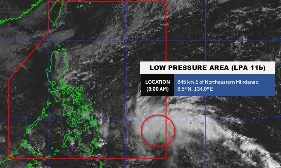 As of 8 am on Sunday, the LPA was located 845 kilometers east of northeastern Mindanao, said the Philippine Atmospheric, Geophysical, and Astronomical Services Administration (PAGASA) in a Facebook post.